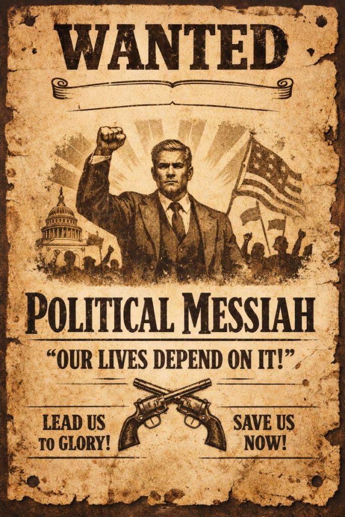 Political soteriology comes with a familiar liturgy. True believers begin with diagnosis: we are oppressed, humiliated, betrayed. Then blame is assigned, and vilification begins: they did this to us, the elites, outsiders, immigrants, or those who are just different; pick your villain. Next comes self-identity: we are the chosen people, the rightful heirs, those whose voices have been stolen. And then the yearning for, seeking, and anointing the savior. The political messiah: the only one who can restore what was taken, punish what was done, and reverse the shame. After the savior is anointed, purification follows. The system must be “cleansed.” Norms and laws become nuisances to be ignored. Anything can be justified if it’s done in the name of the lost cause. Victory is described in pseudo-religious terms: once we win, order, justice, and our greatness return.